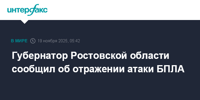 Москва. 19 ноября. INTERFAX.RU - В ночь на среду в Ростовской области была отражена атака беспилотников, сообщил глава региона Юрий Слюсарь.