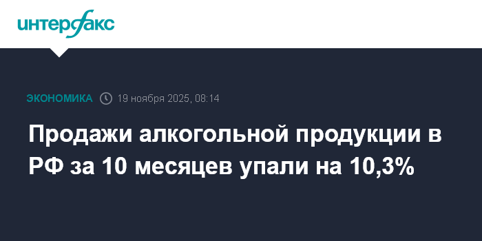 Москва. 19 ноября. INTERFAX.RU - Розничная продажа алкогольной продукции (без пива, пивных напитков, сидра, пуаре и медовухи) в РФ в январе-октябре 2025 года по сравнению с аналогичным периодом прошлого года снизилась на 10,3% до 165,2 млн декалитров (дал), сообщает Росалкогольтабакконтроль.