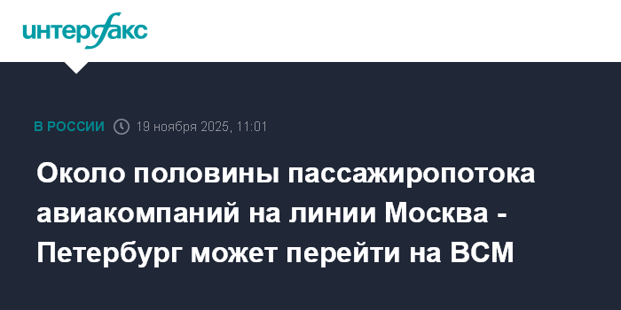 Москва. 19 ноября. INTERFAX.RU - Потребность в авиарейсах между Москвой и Санкт-Петербургом после запуска высокоскоростной железнодорожной магистрали (ВСМ) сохранится, хотя структура спроса существенно изменится, сообщил вице-премьер Виталий Савельев, выступая на "Транспортной неделе - 2025" в среду в Москве.