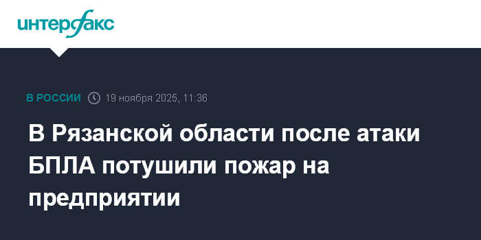Москва. 19 ноября. INTERFAX.RU - В Рязанской области потушили пожар на предприятии, которое загорелось после падения обломков БПЛА, обошлось без пострадавших, сообщил в Telegram губернатор Павел Малков.
