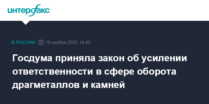 Москва. 19 ноября. INTERFAX.RU - Госдума приняла во втором и третьем чтении закон, который усиливает административную ответственность за повторные нарушения в сфере оборота драгоценных металлов и драгоценных камней (ДМДК).