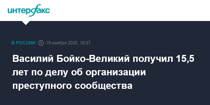 Москва. 19 ноября. INTERFAX.RU - В Подмосковье Можайский городской суд области приговорил к 15 с половиной годам колонии уже осужденного бизнесмена Василия Бойко-Великого по делу об организации преступного сообщества с целью незаконного приобретения земли в Подмосковье, сообщает областная прокуратура.