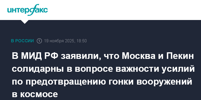 Москва. 19 ноября. INTERFAX.RU - Россия и Китай подтвердили важность совместных усилий по предотвращению гонки вооружений в космосе, сообщили в среду в МИД РФ.