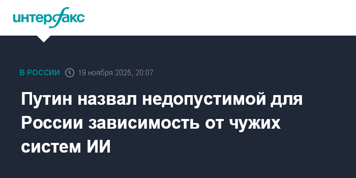 Москва. 19 ноября. INTERFAX.RU - Президент РФ Владимир Путин заявил, что Россия не может допустить критическую зависимость от чужих систем искусственного интеллекта и должна обладать целым комплексом собственных технологий в этой сфере.