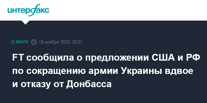 Москва. 19 ноября. INTERFAX.RU - Предложение, которое американская и российская стороны подготовили в рамках процесса украинского урегулирования, предполагает значительное уменьшение численности украинской армии, сообщает в среду издание Financial Times со ссылкой на источники.