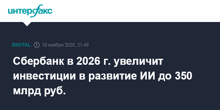 Москва. 19 ноября. INTERFAX.RU - Сбербанк в 2026 году увеличит инвестиции в развитие искусственного интеллекта более чем вдвое - до 350 млрд рублей, сообщил журналистам президент председатель правления банка Герман Греф.