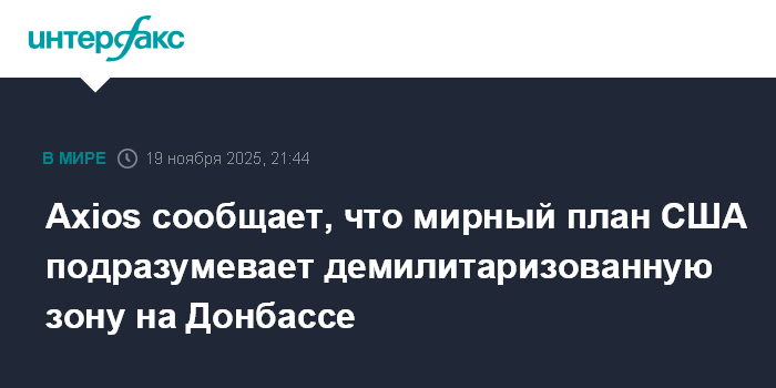 Москва. 19 ноября. INTERFAX.RU - Новый американский план по завершению украинского конфликта подразумевает передачу РФ Донбасса и создание там демилитаризованной зоны в обмен на гарантии безопасности для Украины от Вашингтона, сообщает в среду Axios со ссылкой на источники.
