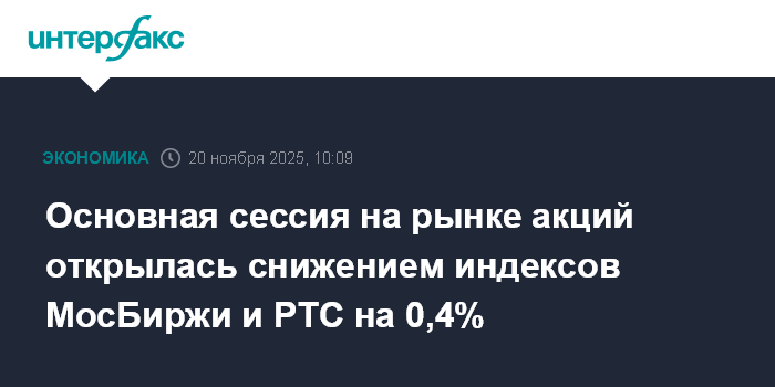 Основная сессия на рынке акций открылась снижением индексов МосБиржи и РТС на 0,4%