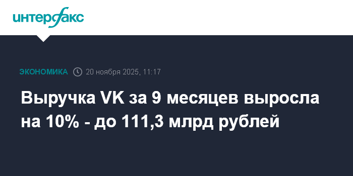 Москва. 20 ноября. INTERFAX.RU - Выручка технологического холдинга VK за девять месяцев составила 111,3 млрд рублей, говорится в сообщении компании.