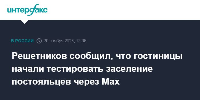 Москва. 20 ноября. INTERFAX.RU - Крупные гостиничные сети тестируют возможность заселения гостей в отели с мессенджером Max, сообщил глава Минэкономразвития Максим Решетников, выступая на XXI съезде Российского союза туриндустрии.