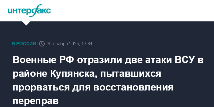 Москва. 20 ноября. INTERFAX.RU - Российские военнослужащие за сутки отразили в Харьковской области две атаки украинских войск, которые пытались деблокировать окруженные формирования ВСУ, прорваться к реке Оскол для восстановления разрушенных переправ, сообщает министерство обороны РФ.