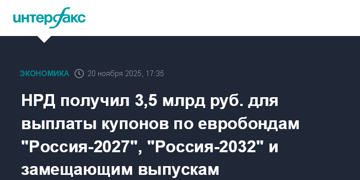 НРД получил 3,5 млрд руб. для выплаты купонов по евробондам "Россия-2027", "Россия-2032" и замещающим выпускам