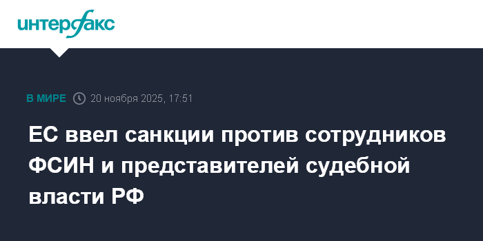 Москва. 20 ноября. INTERFAX.RU - Совет ЕС своим постановлением от 20 ноября ввел ограничительные меры против четырех сотрудников пенитенциарной системы РФ и шести представителей российских судебных органов.