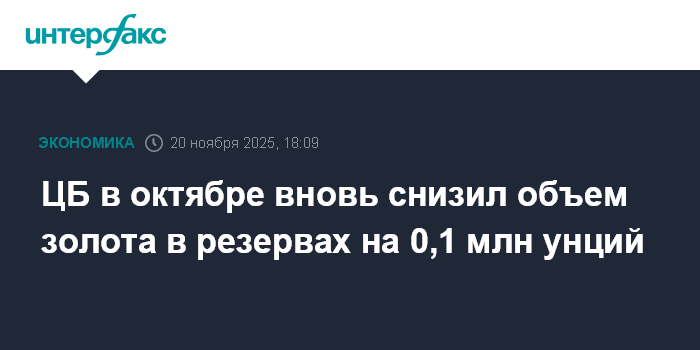 Москва. 20 ноября. INTERFAX.RU - Банк России в октябре вновь снизил объем золота в резервах на 0,1 млн унций (это единицы тонн драгметалла, формат данных ЦБ РФ не позволяет дать более точную оценку).