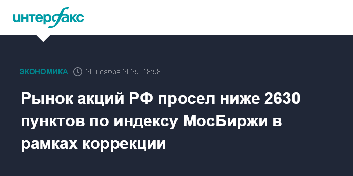Москва. 20 ноября. INTERFAX.RU - Российский рынок акций в четверг скорректировался вниз в рамках фиксации прибыли игроками после 2-дневного роста в ожидании геополитических новостей вокруг переговоров по украинскому урегулированию; фактором поддержки выступили данные Росстата о замедлении годовой инфляции, в то время как ЦБ РФ зафиксировал рост инфляционных ожиданий в ноябре. Индекс МосБиржи на фоне укрепления рубля опустился ниже 2630 пунктов после локального роста днем выше 2660 пунктов.