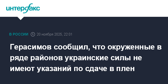 Москва. 20 ноября. INTERFAX.RU - Окруженные в ряде районов украинские силы не имеют указаний от руководства ВСУ по сдаче в плен, заявил начальник Генштаба ВС РФ Валерий Герасимов.