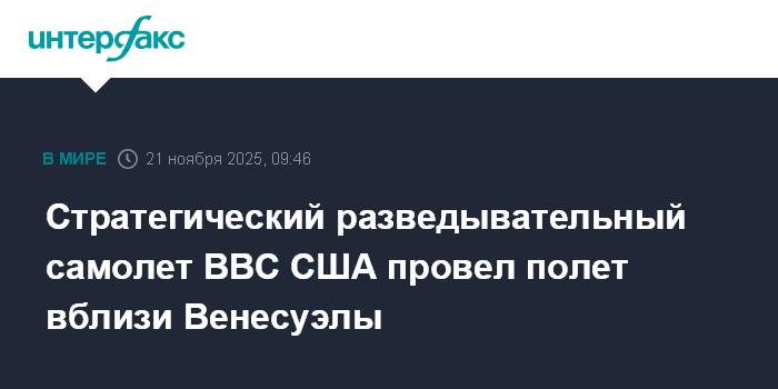Москва. 21 ноября. INTERFAX.RU - Американский стратегический разведывательный самолет RC-135W Rivet Joint провел многочасовой полет вблизи побережья Венесуэлы над нейтральными водами Карибского моря, сообщило издание The War Zone.