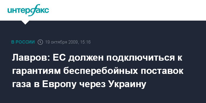 Москва. 19 октября. INTERFAX.RU - Евросоюз должен подключиться к процессу гарантирования бесперебойных поставок российских энергоносителей в Европу через транзитные страны, заявил глава МИД РФ Сергей Лавров. "Рассчитываю, что мы все извлечем урок из тех трудностей, которые возникали в прошлом году ("газовый" кризис - ИФ) и в начале этого года и примем все меры, чтобы они больше не повторились. Со стороны наших украинских партнеров такие заверения звучат, но мы бы считали важным, чтобы Евросоюз подключился к гарантированию бесперебойности поставок", - сказал он в понедельник на пресс-конференции в Брюсселе.
