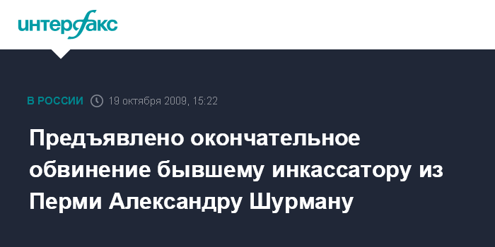 Москва. 19 октября. INTERFAX.RU - Главное следственное управление (ГСУ) ГУВД по Пермскому краю в понедельник предъявило окончательное обвинение бывшему инкассатору Александру Шурману, похитившему в июне этого года из служебной машины 250 млн рублей. Как сообщили агентству "Интерфакс-Поволжье" в ГСУ, А. Шурману обвиняется по п."а,б" ч.4 ст.162 УК РФ (разбой, совершенный с угрозой применения насилия, опасного для жизни и здоровья, группой лиц по предварительному сговору, с применением оружия, организованной группой, в целях завладения имуществом в особо крупном размере). "Сейчас все обвиняемые будут знакомиться с материалами дела, после чего будет составлено обвинительное заключение для утверждения прокурором. Затем материалы дела будут направлены в суд", - сказал представитель ГСУ. По его оценкам, процедура ознакомления с материалами дела займет порядка двух недель.
