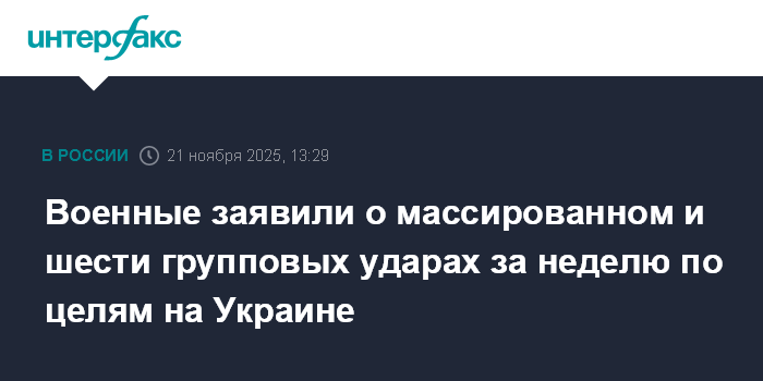 "В ответ на террористические атаки Украины по гражданским объектам на территории России с 15 по 21 ноября Вооруженными силами Российской Федерации нанесены массированный и шесть групповых ударов в результате которых поражены предприятия военной промышленности Украины и объекты топливно-энергетического комплекса, обеспечивавшие их работу, транспортная инфраструктура, используемая в интересах ВСУ", - сказано в сообщении Минобороны, распространённом в пятницу.