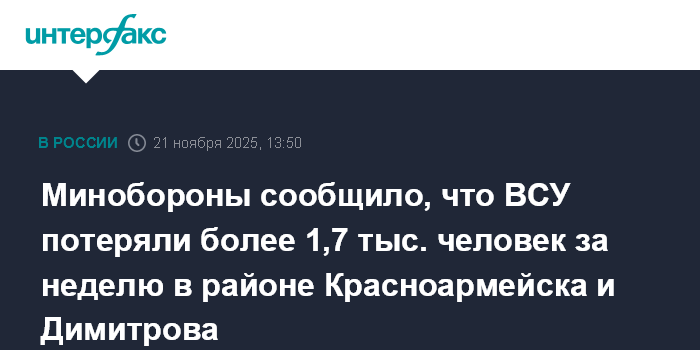 Москва. 21 ноября. INTERFAX.RU - В Минобороны РФ в пятницу сообщили, что российские войска продолжают уничтожение окруженных сил ВСУ в Красноармейске (Покровске), ведут активные наступательные действия в ряде районов Димитрова (Мирнограда), а потери ВСУ за неделю здесь составили свыше 1,7 тыс. военнослужащих.