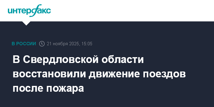 Москва. 21 ноября. INTERFAX.RU - В Свердловской области полностью восстановили железнодорожное движение на перегоне на перегоне Шамары - Кордон, где 19 ноября загорелись две цистерны с газовым конденсатом, сообщила Свердловская железная дорога.