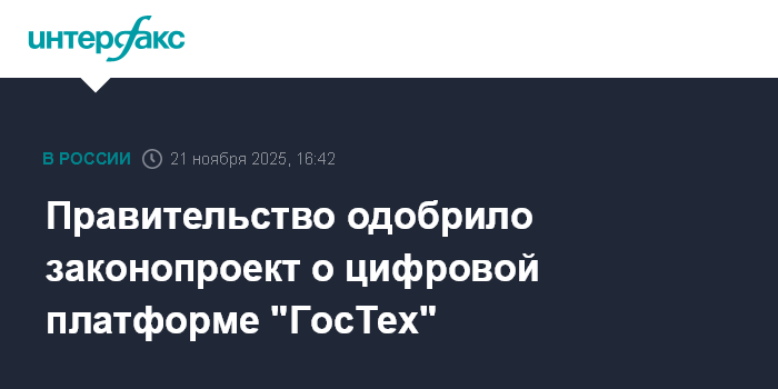 Москва. 21 ноября. INTERFAX.RU - Правительство одобрило проект закона "О единой цифровой платформе Российской Федерации "ГосТех", сообщает пресс-служба правительства.
