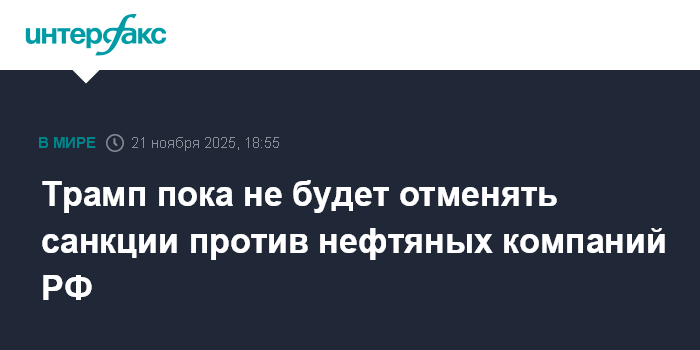 Москва. 21 ноября. INTERFAX.RU - Президент США Дональд Трамп заявил, что в настоящее время не намерен отказываться от введенных им ранее санкций против российских нефтяных компаний, сообщает в пятницу Bloomberg.