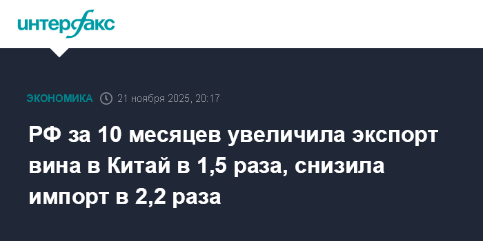 Москва. 21 ноября. INTERFAX.RU - Россия за 10 месяцев 2025 года экспортировала в Китай вина на $1,46 млн, что в 1,5 раза больше, чем за аналогичный период прошлого года (на $952,9 тыс.), сообщается в материалах Государственного таможенного управления (ГТУ) КНР.