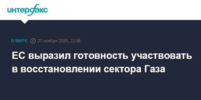 Москва. 21 ноября. INTERFAX.RU - ЕС готов участвовать в восстановлении сектора Газа, придерживаясь при этом резолюций СБ ООН, заявил в пятницу пресс-секретарь главы европейской дипломатии Каи Каллас – Анвар аль-Ануни.