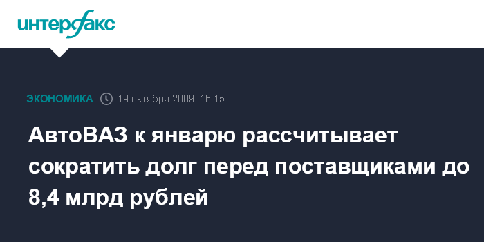 Москва. 19 октября. INTERFAX.RU - Задолженность ОАО "АвтоВАЗ" (РТС: AVAZ) перед поставщиками на 1 ноября составит 9,05 млрд рублей, в том числе просроченная - 2,63 млрд рублей, сообщил на брифинге в Тольятти президент компании Игорь Комаров. На начало января 2010 г. компания рассчитывает сократить этот показатель до 8,4 млрд рублей.