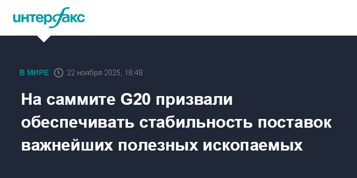 Москва. 22 ноября. INTERFAX.RU - Участники проходящего в ЮАР саммита G20 заявили о необходимости гарантировать устойчивость каналов снабжения ключевыми минеральными ресурсами, говорится в итоговой декларации.