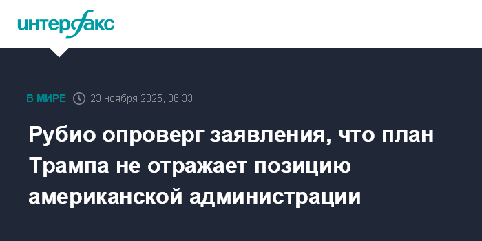 Москва. 23 ноября. INTERFAX.RU - Госсекретарь США Марко Рубио опроверг заявления американских сенаторов о том, что план президента Дональда Трампа по урегулированию на Украине не соответствует его позиции и является отражением российской точки зрения, сообщает телеканал CBS.