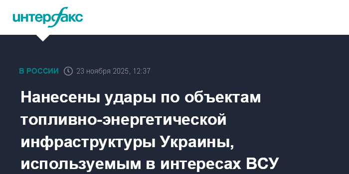 Москва. 23 ноября. INTERFAX.RU - Российские военнослужащие нанесли удары по объектам топливно-энергетической и транспортной инфраструктуры Украины, используемым в интересах ВСУ, уничтожили зенитный ракетный комплекс С-300, заявили в Минобороны РФ в воскресенье.