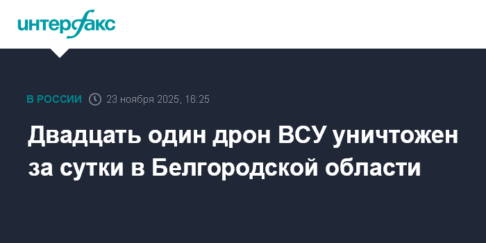 Москва. 23 ноября. INTERFAX.RU - Более двух десятков украинских беспилотников ликвидировано над Белгородской областью за минувшие сутки подразделениями "БАРС-Белгород" и "Орлан", сообщил губернатор региона Вячеслав Гладков в воскресенье.