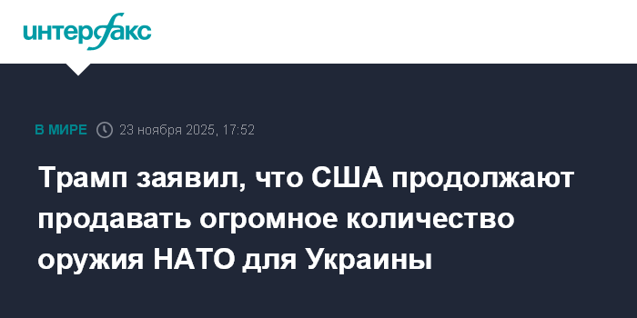 Москва. 23 ноября. INTERFAX.RU - Президент США Дональд Трамп заявил, что Соединенные Штаты продолжают продавать большое количество вооружений странам НАТО для поставок на Украину.