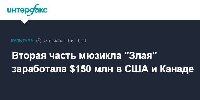 Москва. 24 ноября. INTERFAX.RU - Вторая часть экранизации известного бродвейского мюзикла "Злая" (Wicked) заработала $150 млн в кинотеатрах США и Канады в первые выходные проката, пишет The Wall Street Journal.