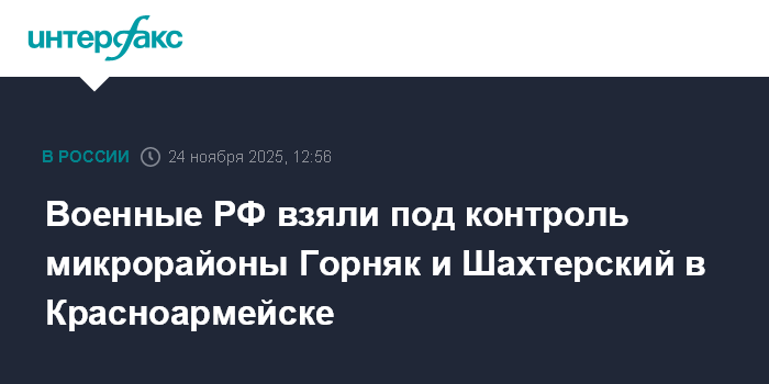 Москва. 24 ноября. INTERFAX.RU - Российские военнослужащие взяли под полный контроль микрорайоны Горняк и Шахтерский в Красноармейске (Покровске) Донецкой Народной Республики, сообщили в Минобороны России в понедельник.