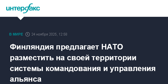 Москва. 24 ноября. INTERFAX.RU - Минобороны Финляндии предложило НАТО разместить на финской территории системы командования и управления альянса. Об этом сообщает пресс-служба ведомства.