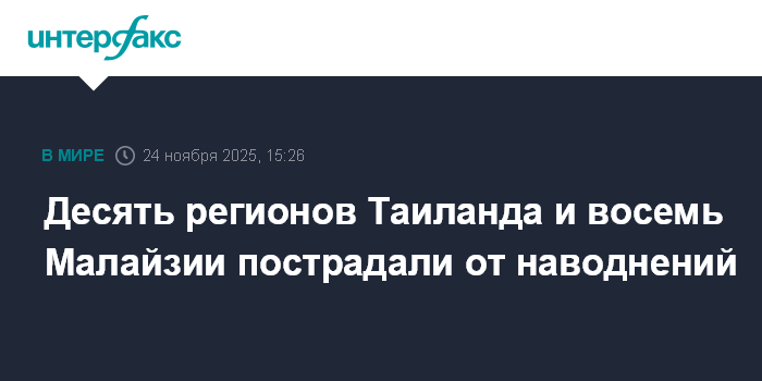 Москва. 24 ноября. INTERFAX.RU - Наводнения, вызванные проливными дождями, привели к гибели восьми человек и эвакуации тысяч в южных провинциях Таиланда, граничащих с Малайзией, сообщают местные СМИ.