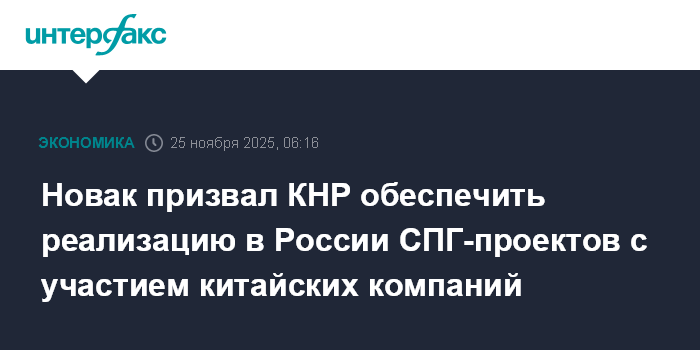 Москва. 25 ноября. INTERFAX.RU - Россия призывает Китай обеспечить необходимые условия для реализации российских арктических проектов по сжижению природного газа (СПГ), где участвуют китайские компании.