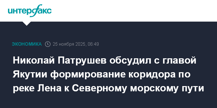 Москва. 25 ноября. INTERFAX.RU - Помощник президента РФ, председатель Морской коллегии Николай Патрушев в ходе рабочей встречи с главой Республики Саха (Якутия) Айсеном Николаевым обсудил вопросы, связанные с формированием интермодального транзитного международного транспортного коридора с выходом по реке Лена на Северный морской путь и Трансарктический транспортный коридор.