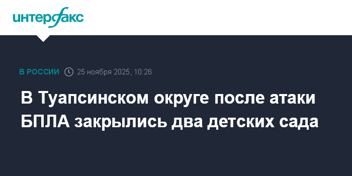 Москва. 25 ноября. INTERFAX.RU - В Туапсинском районе в результате атаки БПЛА повреждения получили два детских сада, их закрыли, сообщил вице-губернатор Краснодарского края Александр Руденко.