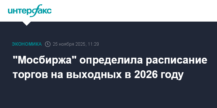 Москва. 25 ноября. INTERFAX.RU -"Московская биржа" опубликовала регламент работы фондового и срочного рынков в выходные дни 2026 года.