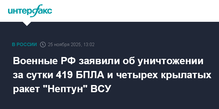 Москва. 25 ноября. INTERFAX.RU - Российскими военными за сутки сбиты 419 украинских дронов, сообщило Минобороны РФ во вторник.