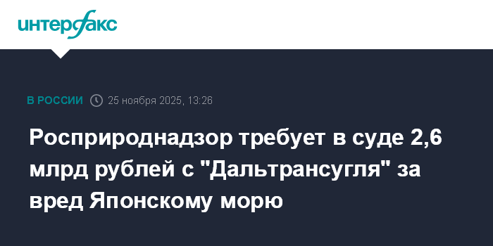 Москва. 25 ноября. INTERFAX.RU - Приамурское межрегиональное управление Федеральной службы по надзору в сфере природопользования (Росприроднадзора) подало иск в Арбитражный суд Хабаровского края о взыскании с АО "Дальтрансуголь" (ДТУ, угольный терминал в порту Ванино, находится под управлением АО "Портовый альянс") 2,6 млрд рублей за вред окружающей среде.
