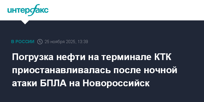 Москва. 25 ноября. INTERFAX.RU - Административный корпус Морского терминала "Каспийского трубопроводного консорциума" под Новороссийском получил повреждения в результате ночной атаки БПЛА, грузовые операции у выносных причальных устройств приостанавливались, сообщает КТК.
