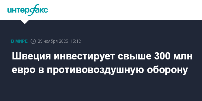 Москва. 25 ноября. INTERFAX.RU - В правительстве Швеции объявили о решении инвестировать дополнительно 3,5 млрд шведских крон (316 млн евро) в систему противовоздушной обороны, сообщают европейские СМИ.