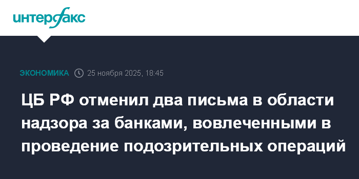 ЦБ РФ отменил два письма в области надзора за банками, вовлеченными в проведение подозрительных операций