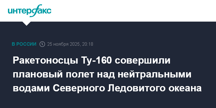 Москва. 25 ноября. INTERFAX.RU - Стратегические ракетоносцы Ту-160 выполнили плановый полет в воздушном пространстве над нейтральными водами Северного Ледовитого океана, сообщили в Минобороны России.
